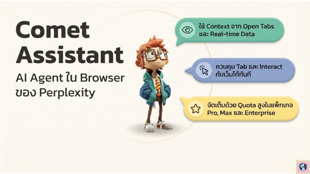 - Comet Assistant (browser‑style agent) ทำหน้าที่ใกล้เคียง “Copilot เวลา research บนเว็บ” – เหมาะกับเวลาต้องเปิดหลายแท็บ, อ่านหน้าเว็บยาวๆ, และสรุปข้ามหลายโดเมน